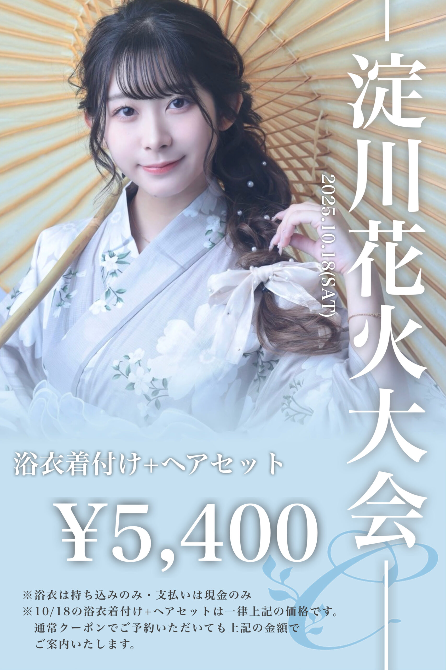 淀川花火大会のお知らせ 【浴衣着付け&ヘアセット ¥5,400】 10/18(土)限定クーポ...